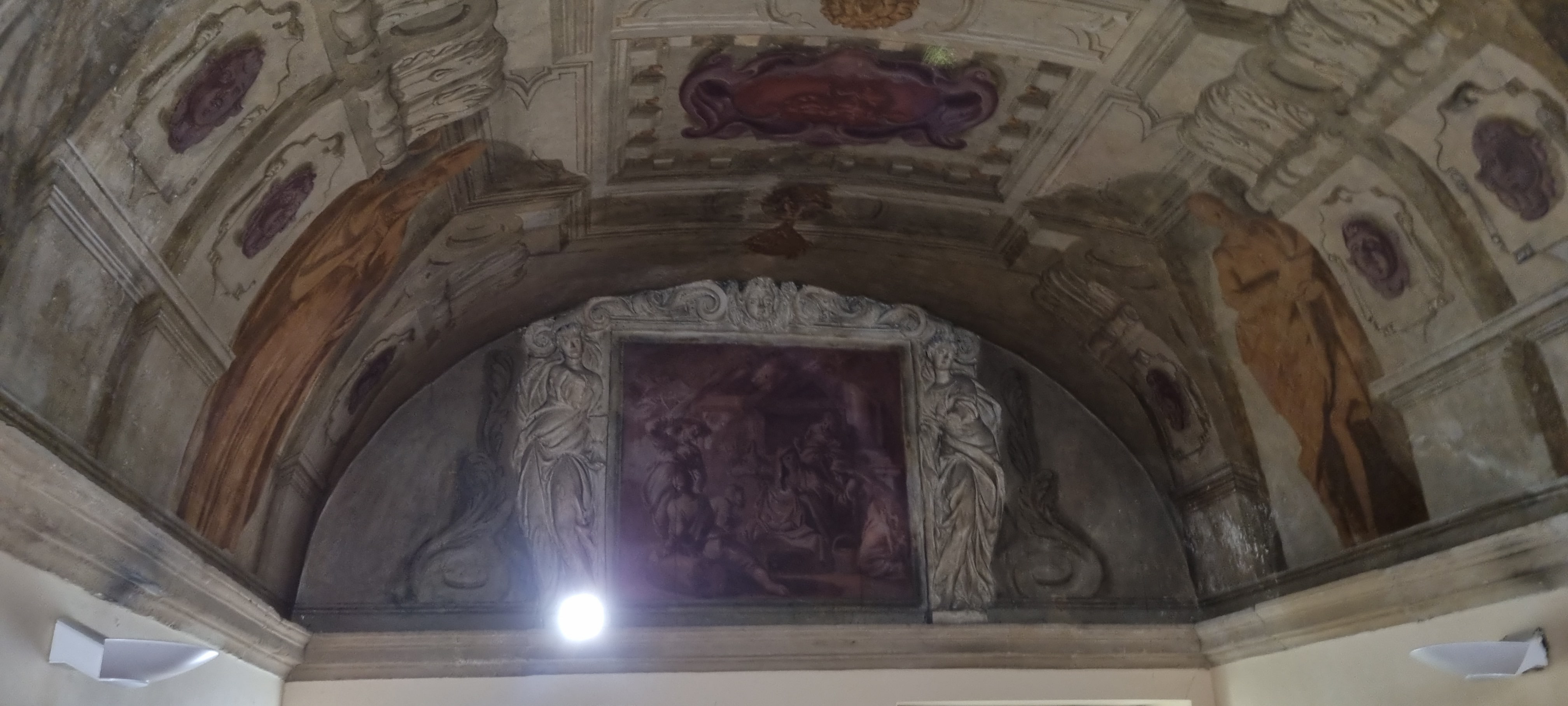 Volta a botte affrescata con finta architettura, figure di santi a monocromo entro finte cornici a carouche e finte sculture di santi a figura intera poggianti sulla struttura architettonica