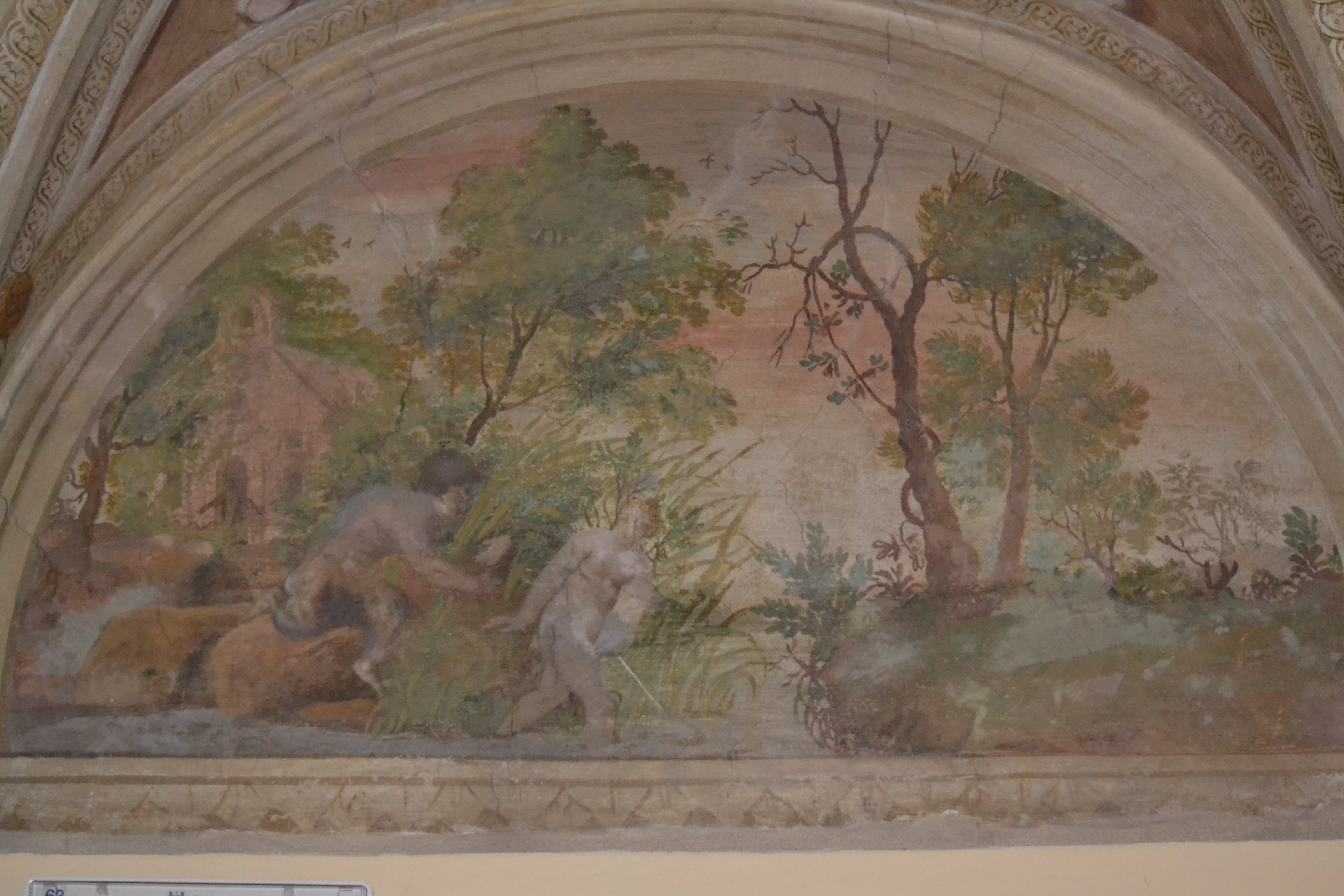 Lunetta con finta cornice marmorea modanata in cui è inscritto un paesaggio agreste con fiume, con satiro [Pan] e ninfa [Siringa] sulla sinistra. Sullo sfondo, dallo stesso lato, è raffigurata una chiesetta