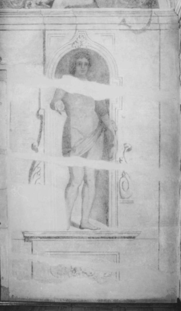 Finta edicola contenente una scultura dipinta di giovane stante, con braccio destro mutilo e drappo che gli cinge la vita