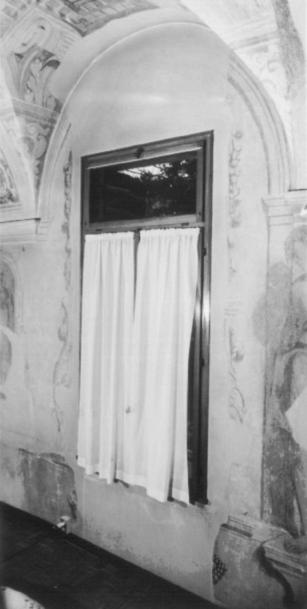 Motivi decorativi a finti stucchi con volute ed elementi fitomorfi che incorniciano la finestra e ricoprono la volta