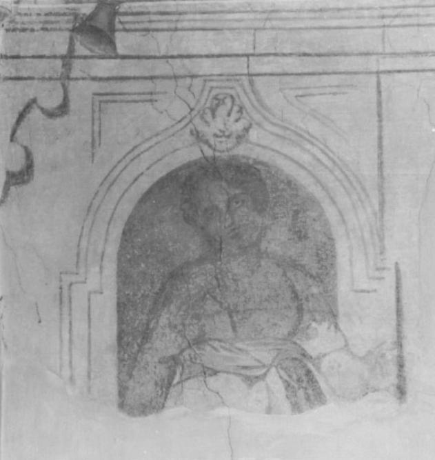 Lacerto di finta edicola dipinta con figura femminile a monocromo simulante una scultura. Compromessa la porzione inferiore dell'affresco