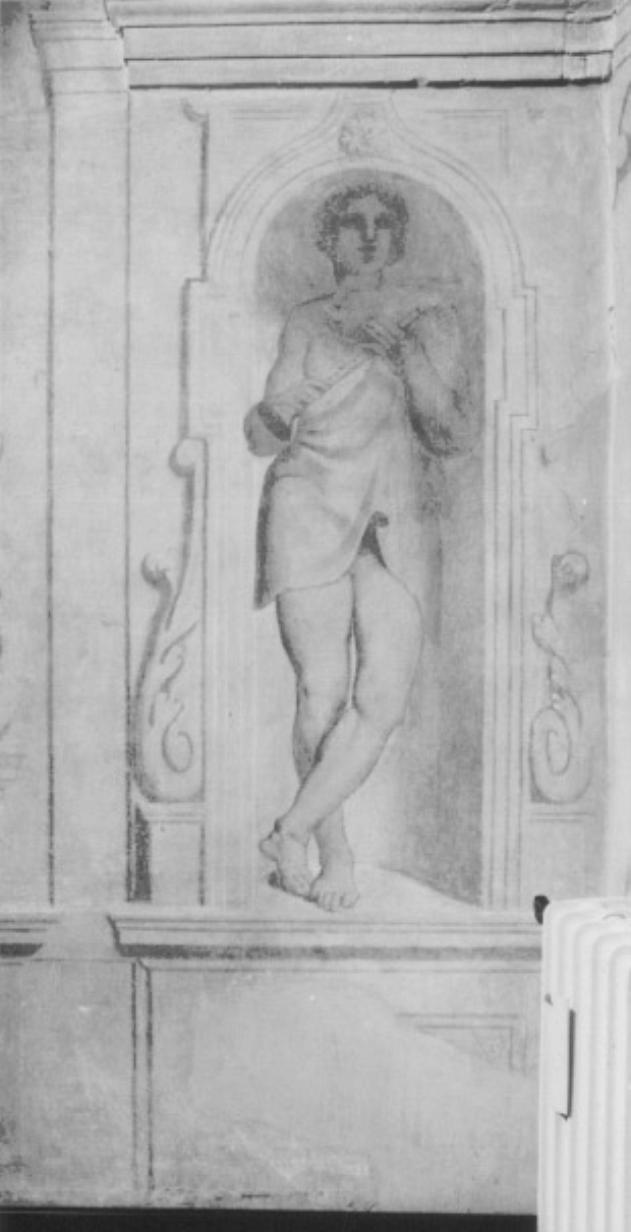 Finta edicola dipinta con volute fitomorfe laterali e una scultura dipinta a monocromo raffigurante un giovane con una corta veste all'antica e un salpinx tra le mani