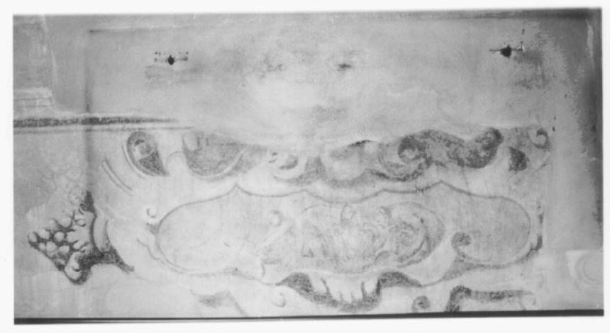 Finta cornice a cartouche dipinta, con elementi fitomorfi e scena a monocromo centrale