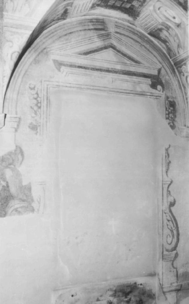 Finta cornice architettonica con elementi fitomorfi laterali e frontone triangolare superiore