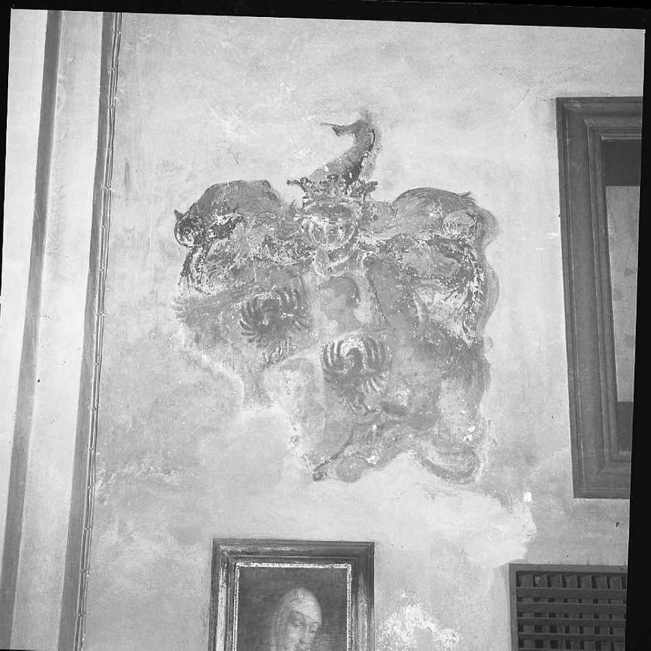 Stemma contenuto entro motivo decorativo sovrastato da cimiero