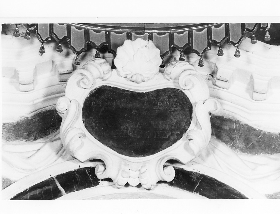 La targa è racchiusa da un cartiglio in pietra decorato, sulla sommità, da una conchiglia e, attorno, da riccioli e volute