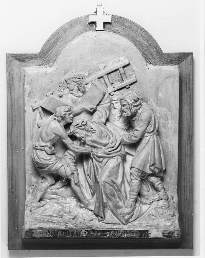 Personaggi: Cristo;simone Cireneo. Figure: figure maschili. Oggetti: croce; scala