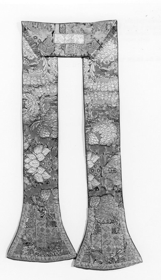 Tessuto: fondo raso color salmone; motivi ottenuti per trame lanciate e broccate in fili di seta policromi e oro filato. Fodera: rasatello di cotone rosso. Gallone: a telaio in oro filato e filo di seta giallo. Decorazione: motivo unico ad asse centrale con tralci fioriti