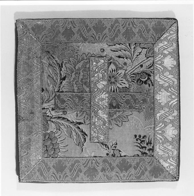 Tessuto: fondo raso color salmone; motivi ottenuti per trame lanciate e broccate in fili di seta policromi e oro filato. Fodera: rasatello di cotone rosso. Gallone: a telaio in oro filato e filo di seta giallo. Decorazione: motivo unico ad asse centrale con tralci fioriti