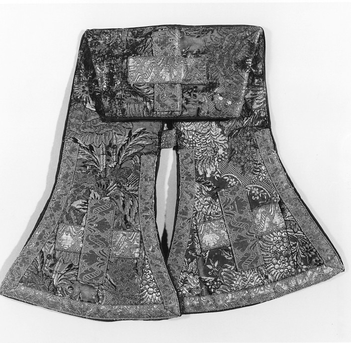 Tessuto: fondo raso color salmone; motivi ottenuti per trame lanciate e broccate in fili di seta policromi e oro filato. Fodera: rasatello di cotone rosso. Gallone: a telaio in oro filato e filo di seta giallo. Decorazione: motivo unico ad asse centrale con tralci fioriti