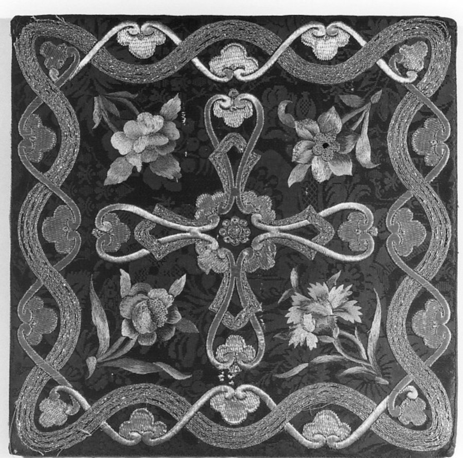 Tessuto: monocromo rosso con fondo in raso faccia catena e disegno in raso faccia trama; ricamo a punto pieno, punto raso e punto vapore in seta policroma. Oro filato e lamellare, con applicazione di pailettes. Fodera: rasatello di cotone rosso. Decorazione: motivo ad andamento verticale con fiori