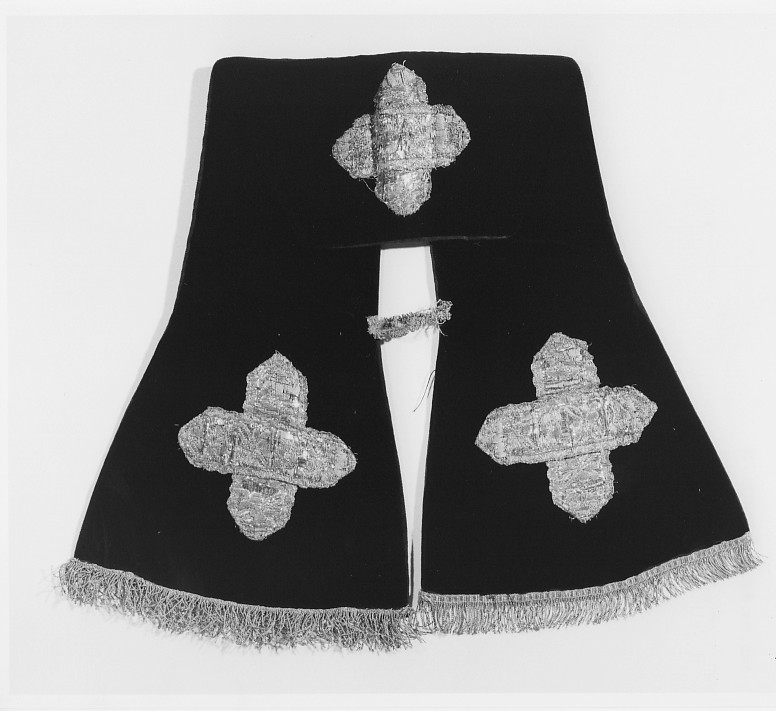 Tessuto: monocromo nero. Fodera: tela di lino cerata nera. Gallone: a telaio in filo dorato, filato e lamellare