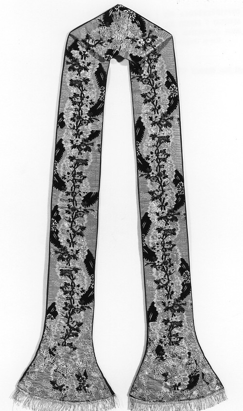 Tessuto: fondo cannetillé verde salvia con motivi ottenuti per trame broccate in fili di seta policromi, ciniglia, oro e argento lamellare. Fodera: rasatello di cotone verde. Gallone: a fuselli in argento filato e lamellare. Decorazione: motivo a meandri con nastri e mazzi di fiori
