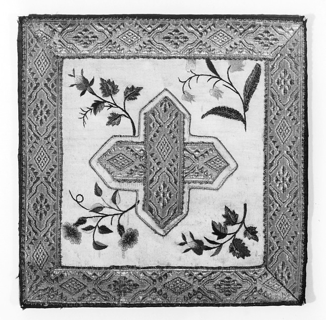 Tessuto: fondo avorio ricamato a punto erba, pieno e pittura in fili di seta policromi e filo dorato, filato e lamellare, con applicazione di pailettes. Fodera: gros de Tours di seta rosso. Gallone: a telaio in filo dorato. Decorazione: motivo a teorie orizzontali con andamento alterno di mazzetti di fiori e tralci vegetali