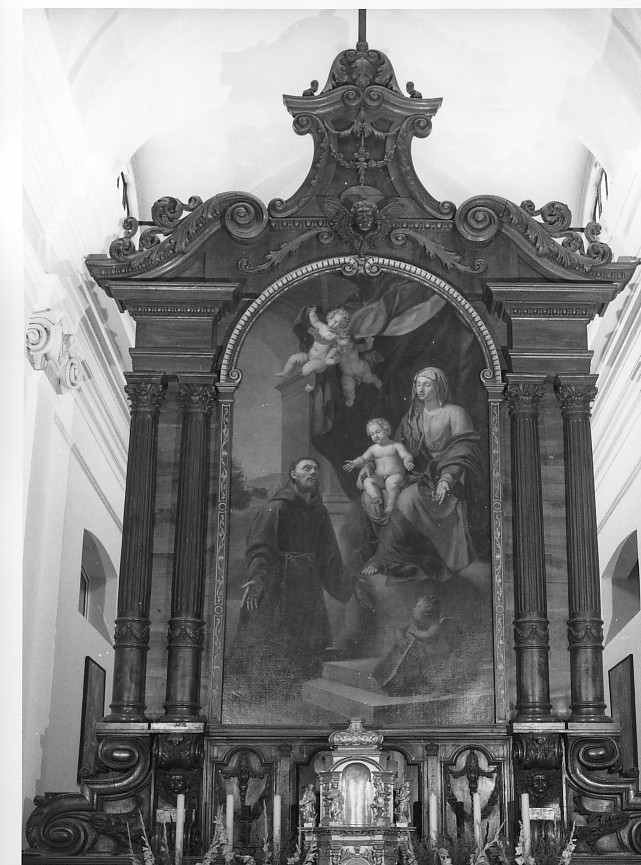 Pala d'altare con timpano mistilineo sorretto da quattro colonnine scanalate con capitello corinzio che affiancano la nicchia contenente un dipinto raffigurante la Madonna col Bambino, San Francesco e angeli