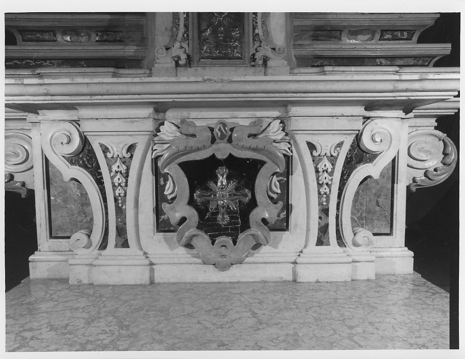 Paliotto con motivi decorativi vegetali e volute, al centro cartoccio con croce all'interno