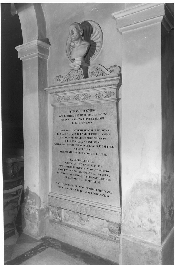 - ISCRIZIONI DON CARLO GVIDO/ DEI MARCHESI BENTIVOGLIO D'ARRAGONA/ GRANDE DI SPAGNA DI PRIMA CLASSE/ E' QVI TVMVLATO/ STIRPE DEGLI ANTICHI SIGNORI DI BOLOGNA/ PARI ALL'ALTEZZA DEI NATALI EBBE L'ANIMO/ FV CVLTO PIO MVNIFICIO MITE MODESTO/ DELLA FAMIGLIA AMATISSIMO/ SCHIVO DEGLI ONORI ESEMPIO DI LEALTA' E CORTESIA/ A TVTTI CARO/ SERENO NELL'ASPETTO COME NEL CVORE/ LA MOGLIE ED I FIGLI/ VOLLERO CHE LE SPOGLIE DI LVI/ RIPOSASSERO IN QVESTO AVITO SVO PREDIO/ ACCIO' PIV' VIVA NE RIMANESSE LA MEMORIA/ ED AVESSE PIV' COPIOSO E PERENNE TRIBVTO/ DI LACRIME E DI BENEDIZIONI/ NATO IN FERRARA IL XXIV FEBBRAIO MDCCLXIX/ MORI' IN VENEZIA IL IV AGOSTO MDCCCXLIII - lettere capitali -