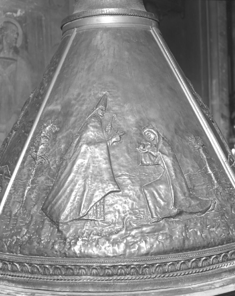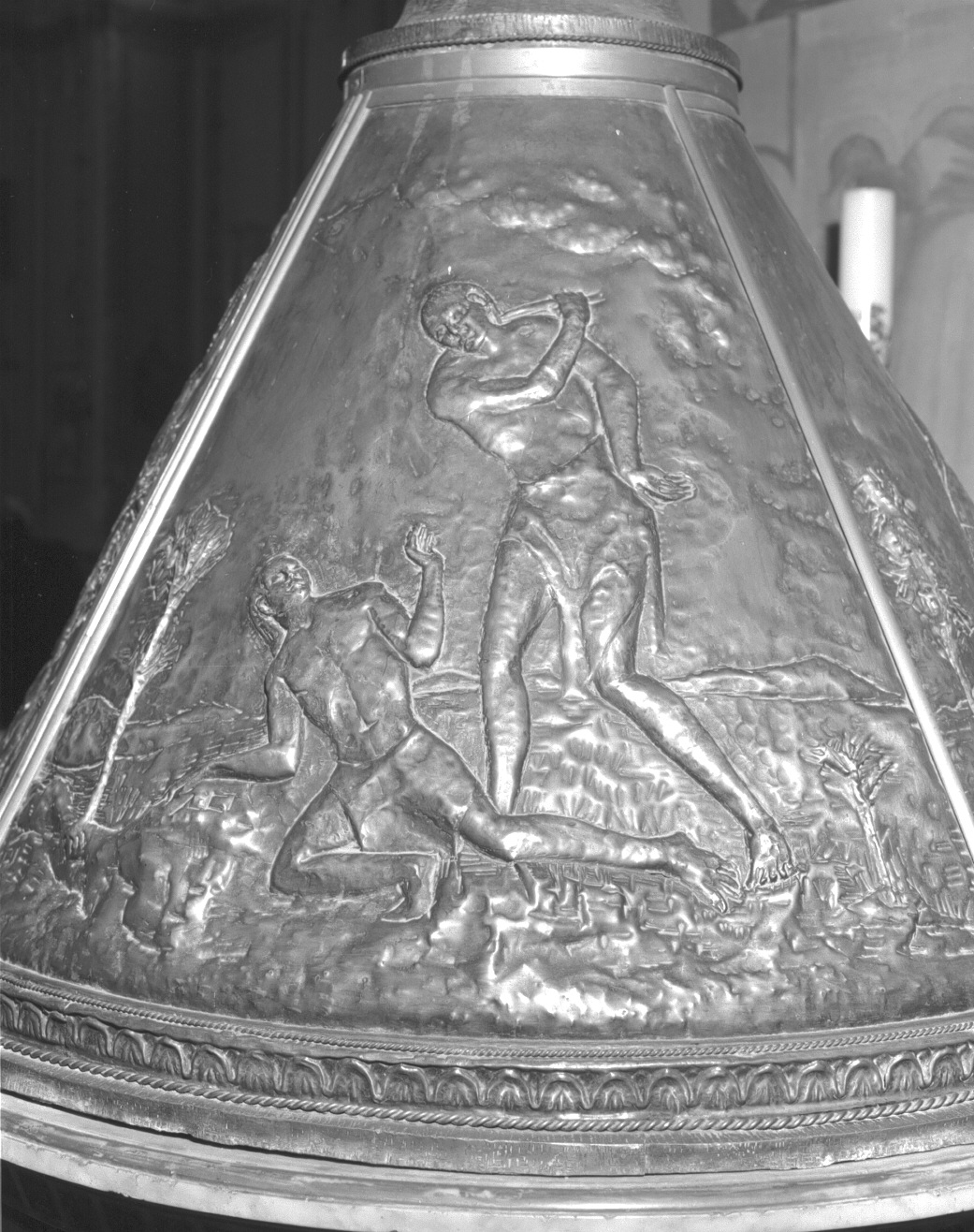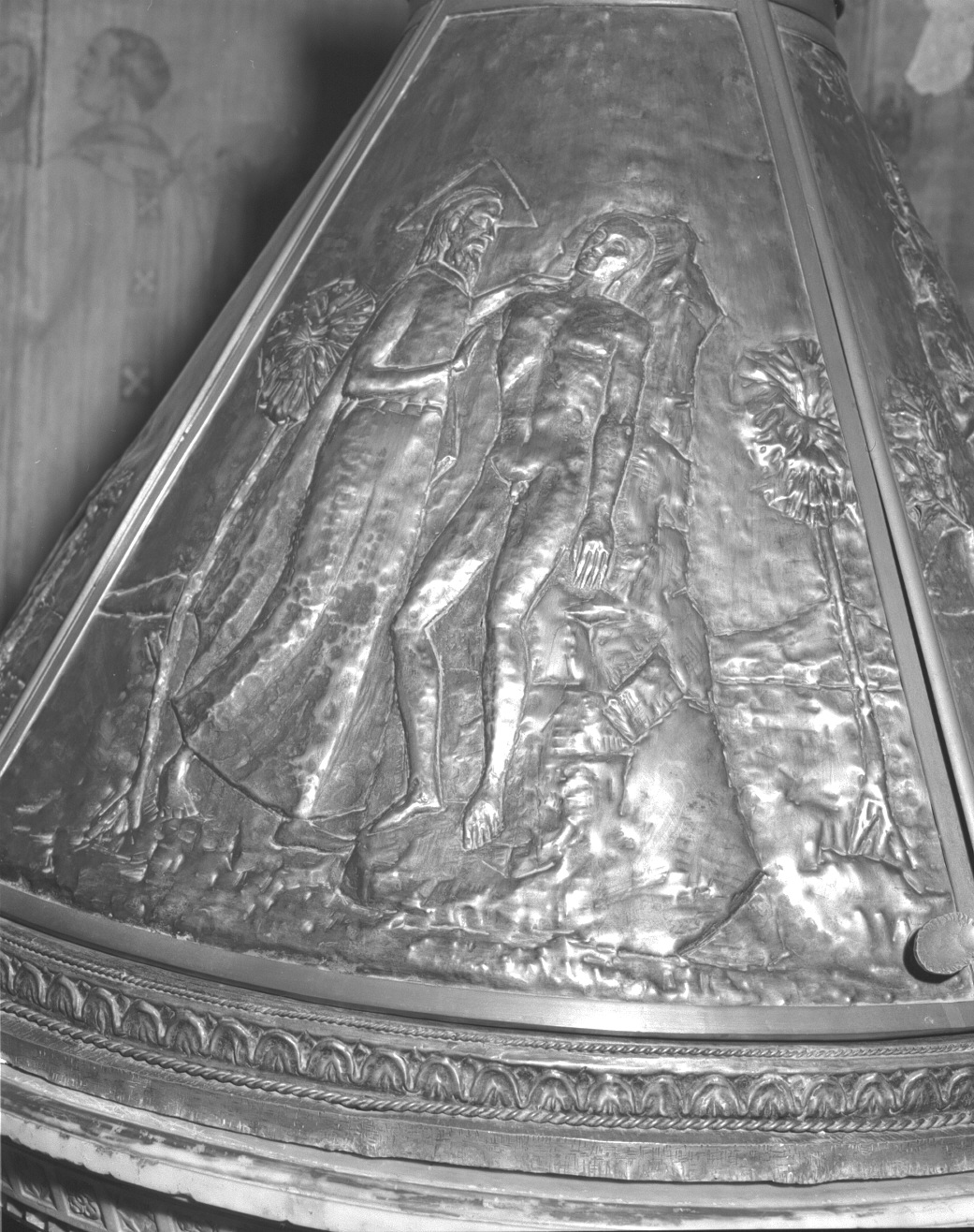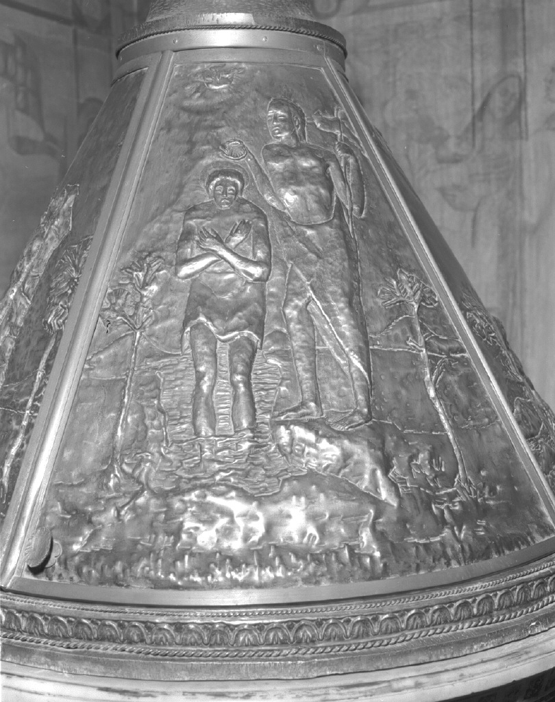 - NOTIZIE STORICO CRITICHE Il cono di rame sbalzato con quattro spicchi raffiguranti:Il battesimo di Gesù, La resurrezione di Lazzaro, Il martirio di Abele, L'omaggio di Venezia al patriarca, che fungeda copertura, è opera posteriore rispetto alla vasca e situabile nei primi decenni del XX secolo