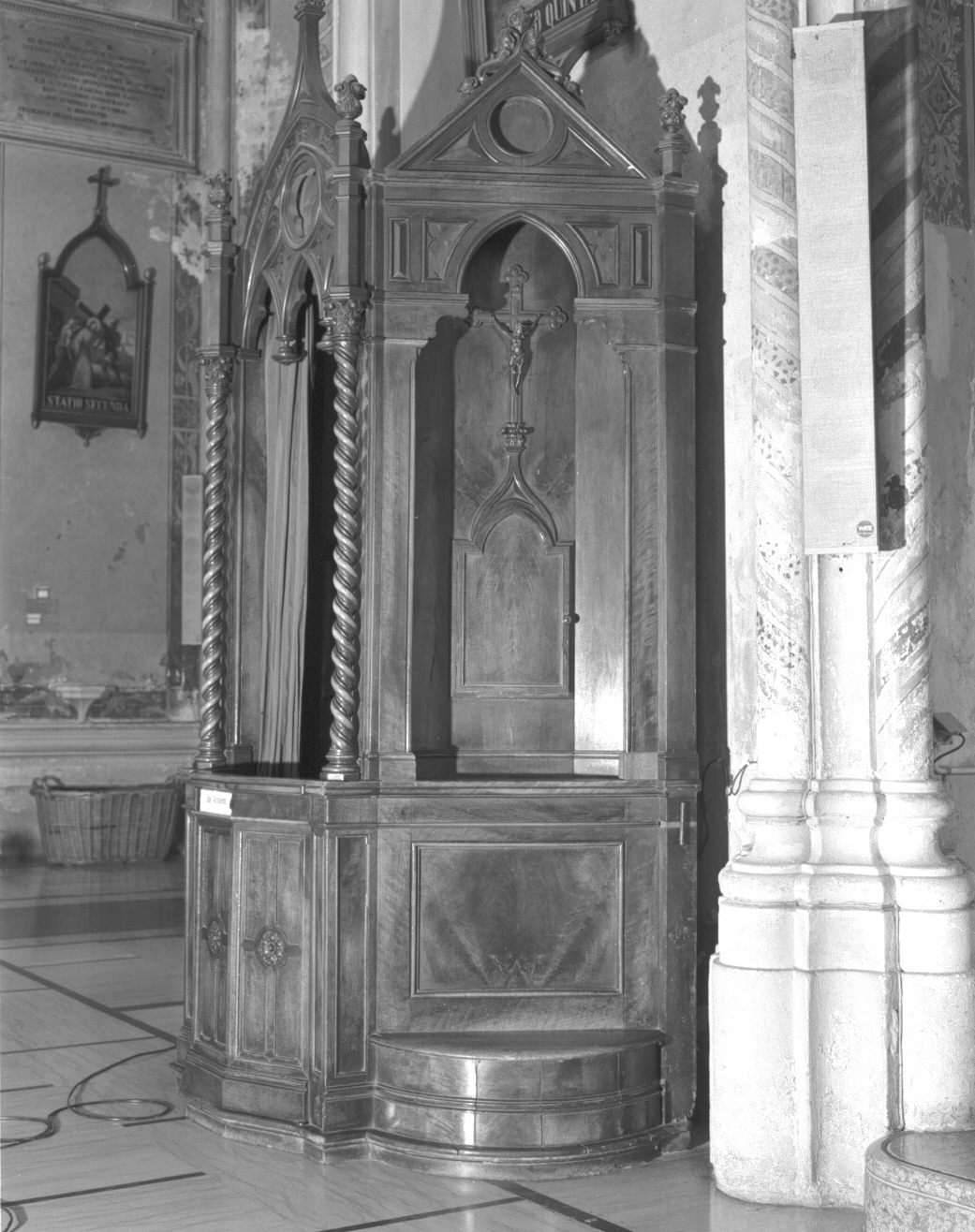 Piccolo crocifisso avente la croce, lobata con gusto neogotico, a rilievo e il Cristo a tutto tondo. E' posto sopra le finestrelle laterali dei confessionali