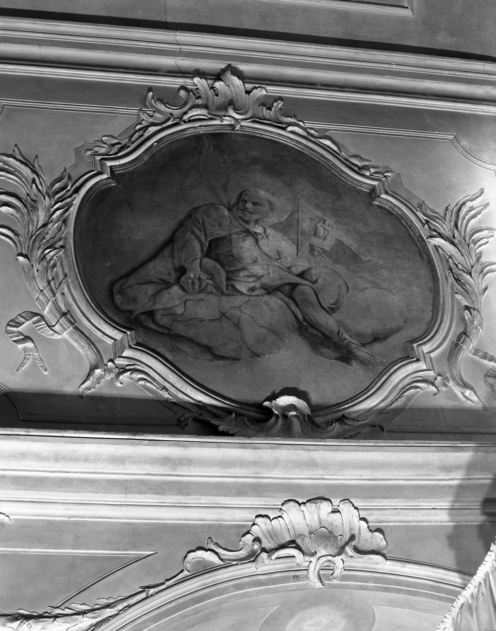- NOTIZIE STORICO CRITICHE Il santo raffigurato in questo ovato è con ogni probabilità San Tommaso apostolo il quale ha come attributo la squadra del costruttore o la riga da disegno; il santo è appunto patrono dei costruttori e degli architetti