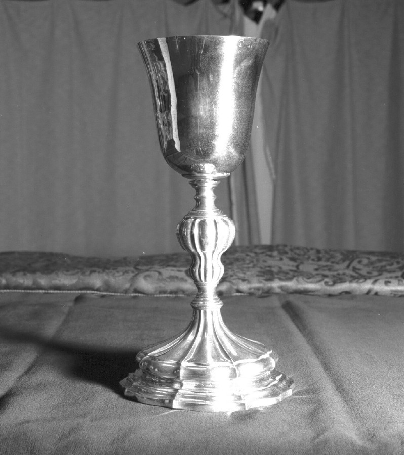 Piede a base circolare modanata; larghe coste percorrono sia il collo del piede che il nodo a vaso sagomato; la coppa è liscia e internamente dorata