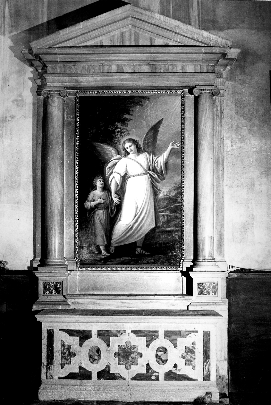 Altare poggiante su due gradini: due colonne con capitelli ionici reggono un architrave sul quale poggia un timpano triangolare