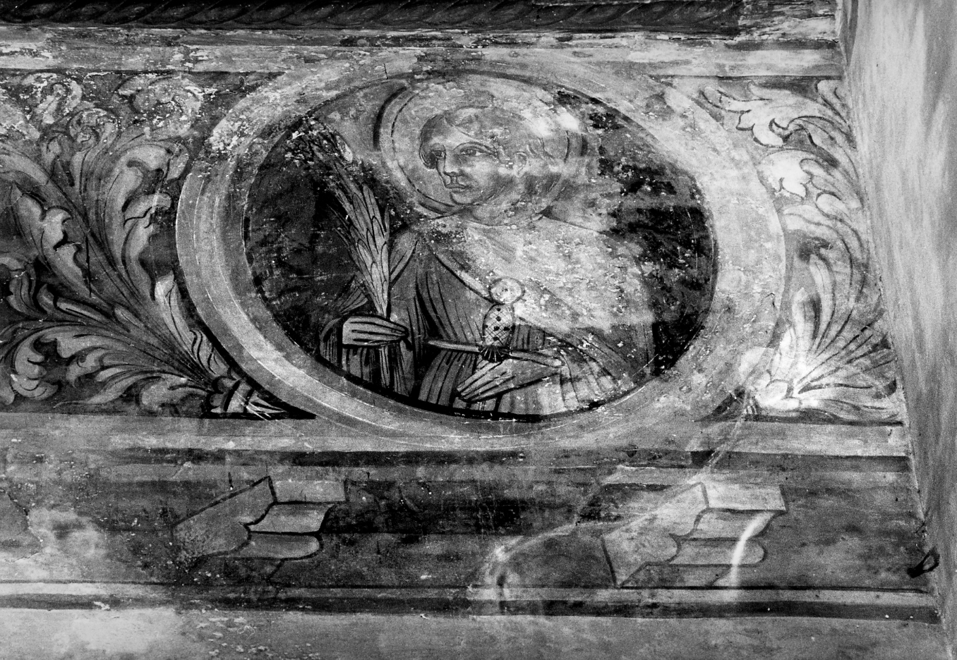 Clipeo racchiuso da tre fasce. Santo martire rappresentato a mezza figura con la palma del martirio nella mano di sinistra. Ha volto glabro; aureola; mantello che gli copre le spalle e stringe nella mano di destra l'elsa di una spada