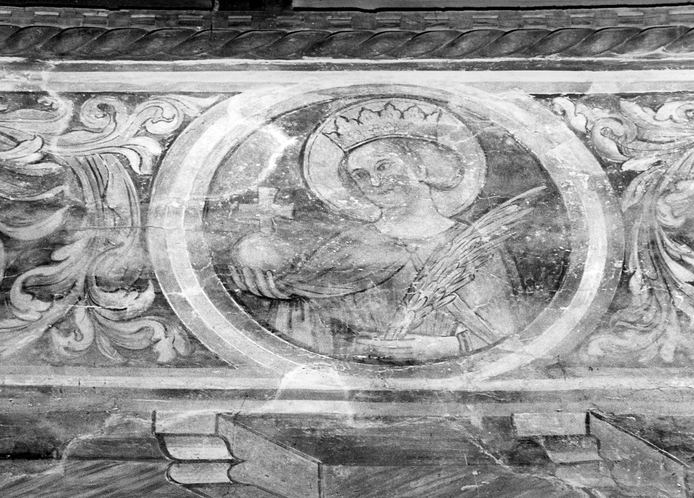 Clipeo racchiuso da tre fasce. Santa rappresentata a mezza figura con la palma del martirio nella mano di destra. Religione cristiana. Ha corti capelli; corona; aureola; nella mano di destra tiene la palma del martirio e in quella di sinistra il globo sormontato da una croce