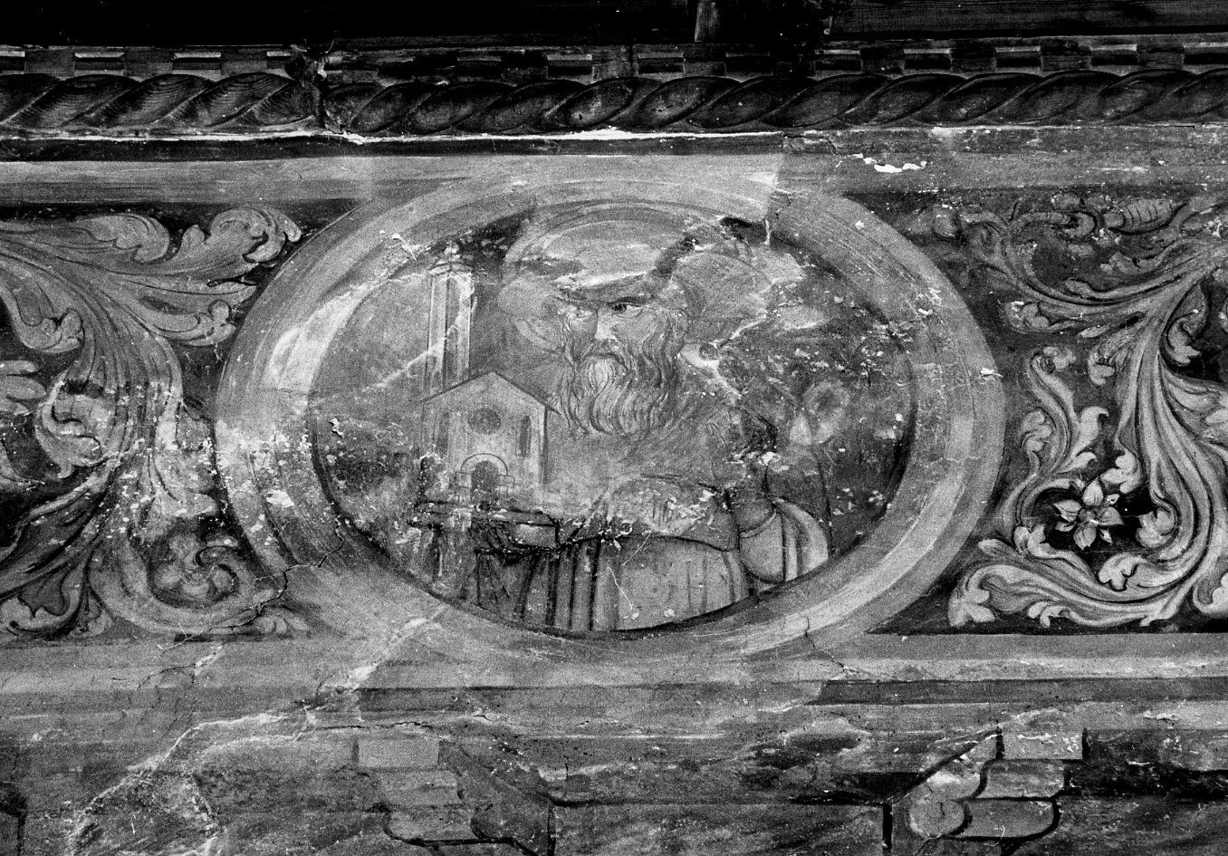 Clipeo racchiuso da tre fasce. Santo rappresentato a mezza figura con modellino di chiesa nella mano di sinistra. Ha aureola; barba fluente; mano destra alzata in segno di benedizione. L'abbigliamento religioso, che parebbe un abito francescano, fa pensare che il santo raffigurato sia S. Bernardino da Siena