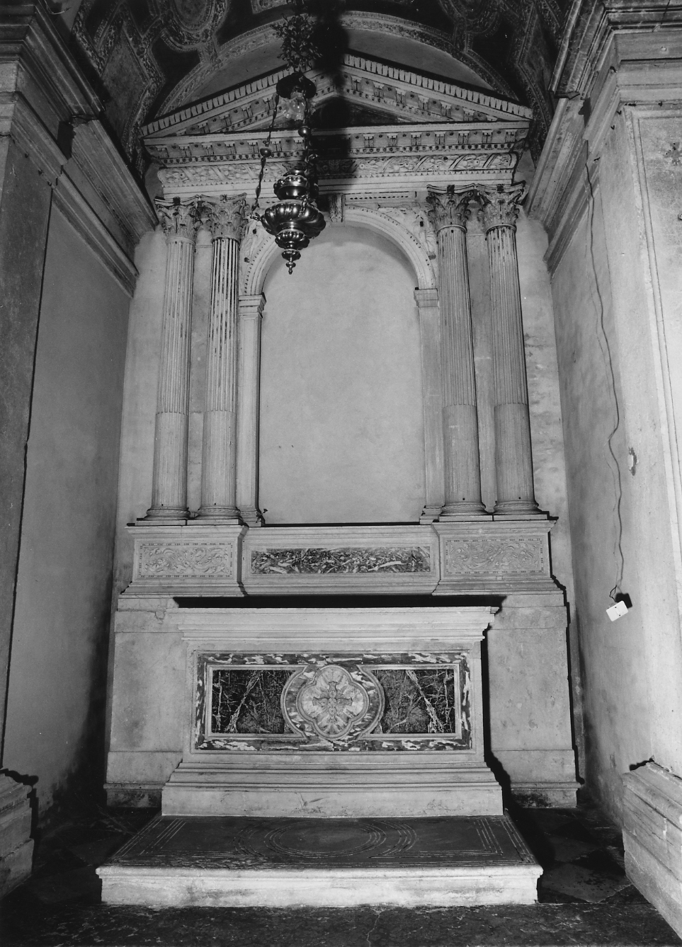 L'altare, in marmo e pietra tenera, ispirato a modelli classici, ha alla base un paliotto uguale a quello dell'altare di S. Sebastiano (scheda 0500137591). Dietro al paliotto, su un alto basamento, sono impostate due coppie di colonne corinzie, dal fusto rastremato, sormontate da un architrave, dalla preziosa decorazione a nastri di alloro, coronato da un timpano riccamente modanato. Nello spazio fra le due coppie di colonne è inserita una cornice costituita da due pilastri sormontati da un arco a tutto sesto