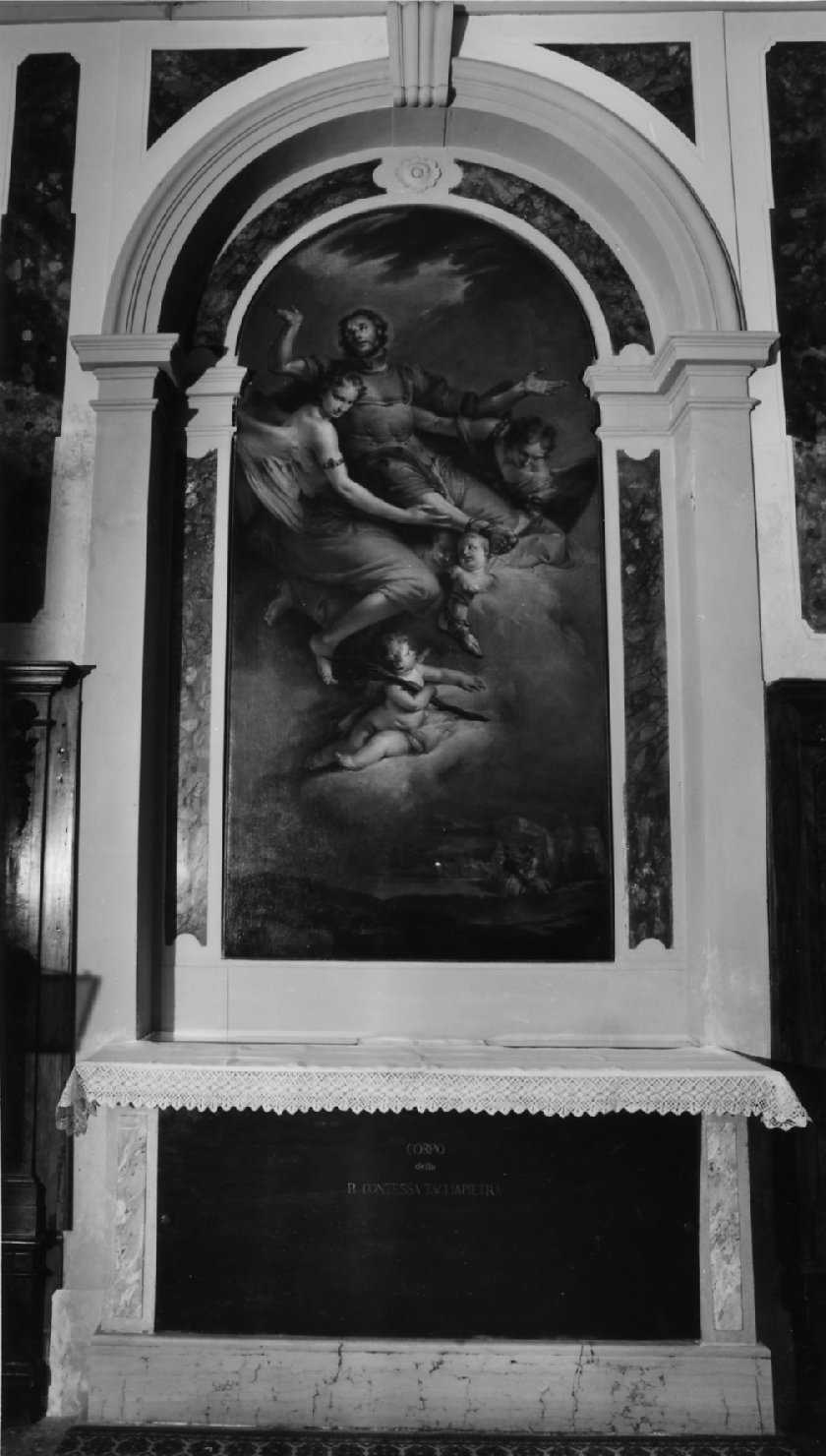 Il frontale dell' altare è costituito da un pannello ligneo con iscrizione sepolcrale. La pala d'altare è collocata entro una cornice di strisce di carta marmorizzata di color rosa, e in una più esterna di legno dipinto a imitazione della pietra