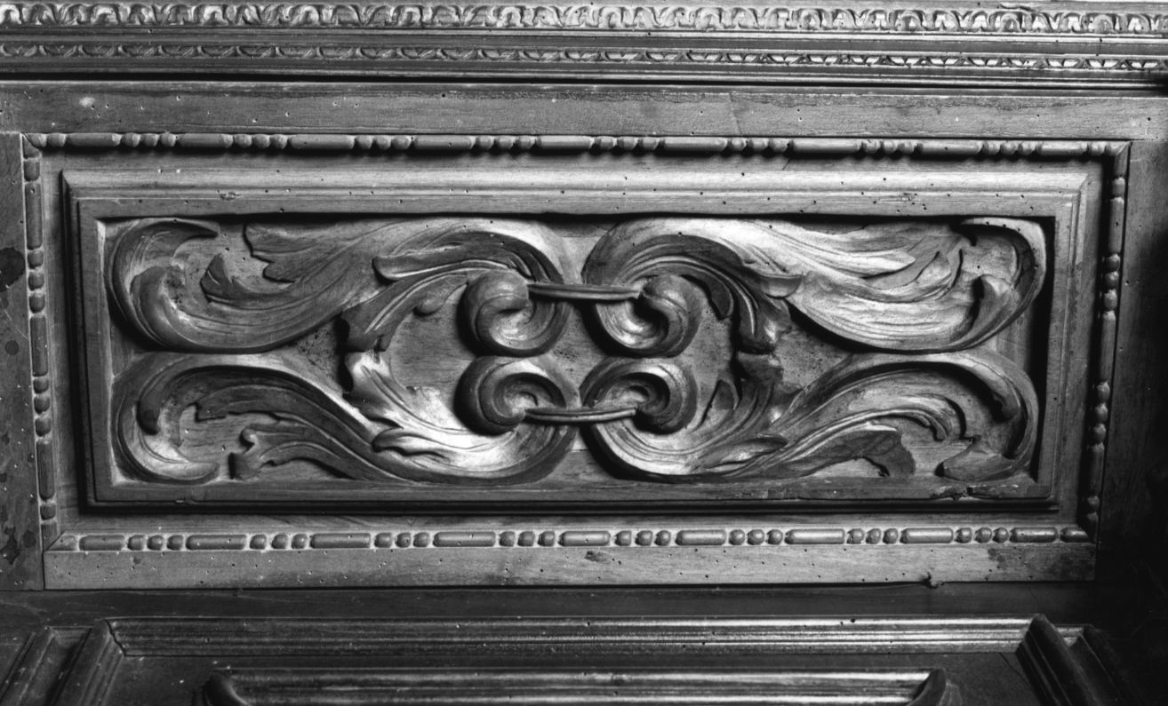 Intreccio di foglie disposte a forma di lira; le volute al centro sono legate da elementi orizzontali (cfr 17.26)