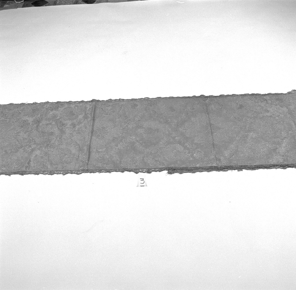 Motivo decorativo simmetrico rispetto all'asse centrale, ad andamento ondulante verticale. Colore giallo. Damasco lamato. Gallone in seta e in oro