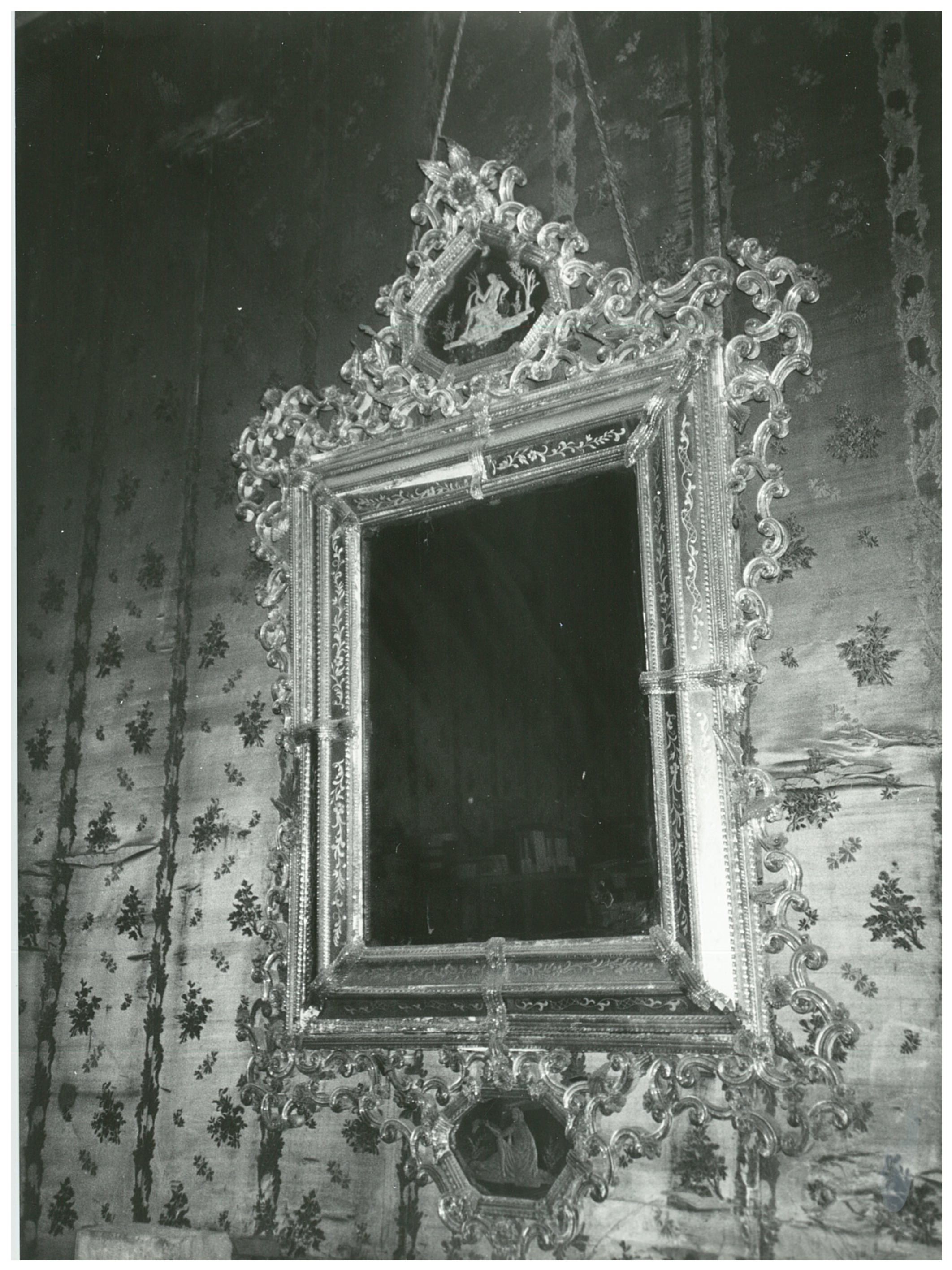 doppia bordura con segmenti di specchio inciso, cimasa e decorazione parte inferiore in vetro molato e riporti di specchio inciso