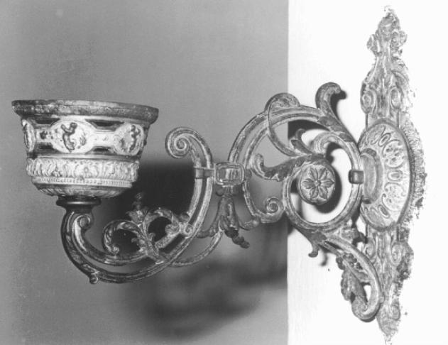 Appoggio al muro: decoro circolare centrale e terminazioni a struttura triangolare con bordo a volute. Braccio: a doppio girale, portalampada: a bicchiere, decorata a fascie sovrapposte