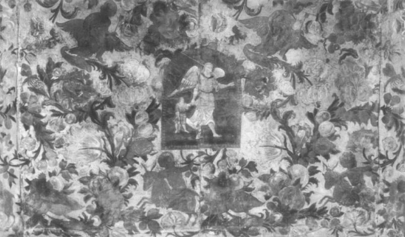 Paliotto mobile. Decorazione: angelo custode guida un bambino entro cornice centinata. Decorazione: motivo decorativo a festoni di frutta e fiori con cornucopie; pellicani; cinghiali; tori; libellule; grappoli d'uva
