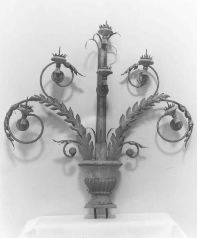 Piede: a sezione circolare; corpo: baccellato; braccio porta candela centrale: diritto con due piattelli torniti; bracci porta candela laterali: a volute divergenti in ferro battuto, terminanti con un piattello; decorazione a fogliame in lamina