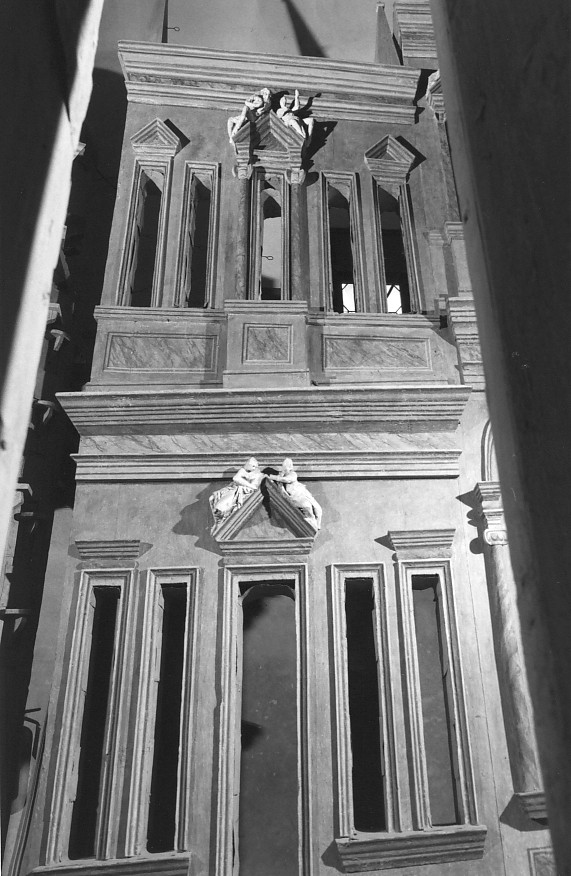 Facciata di palazzo a due piani con finestre rettangolari decorate da timpani semplicemente modanati e timpani triangolari con statuette