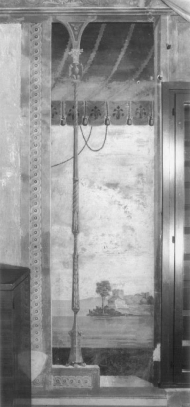 L'affresco simula l'apertura verso una veduta lagunare di un padiglione con tendaggio, sostenuto da un'esile colonnina con zampe leonine e una figura d'aquila nel tratto superiore; la tenda è decorata con gigli e presenta cordoni dorati. Oltre l'apertura si vede un'isoletta, separata da un tratto di mare, su cui si erge un edificio con torre (forse una chiesetta). Sullo sfondo, profilo montano