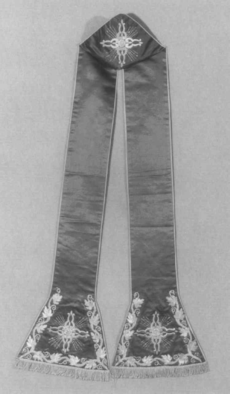 Parametro composto da: pianeta; stola; borsa; velo di calice. Profilatura per tutta la lunghezza. Motivi cruciformi raggiati al centro e alle estremita'. Estremita' definite da tralci di vite e frangia in filo d'argento