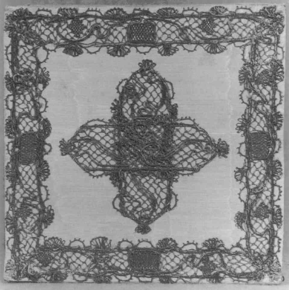 Fondo avorio. Croce centrale e bordi definiti da galloni a fuselli in filo d'oro