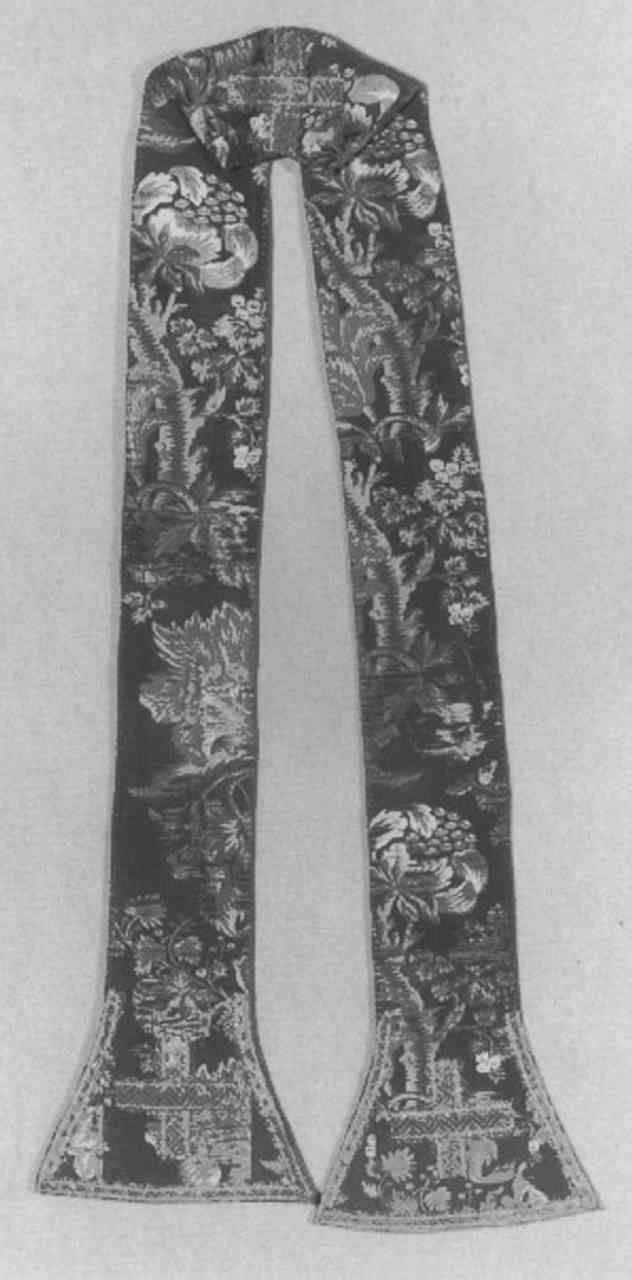 Fondo verde. Decorazione: motivo naturalistico a grande formato con tralci di fiori, foglie, bacche. Croce centrale e alle estremita' bordi in galloni a telaio in oro filato