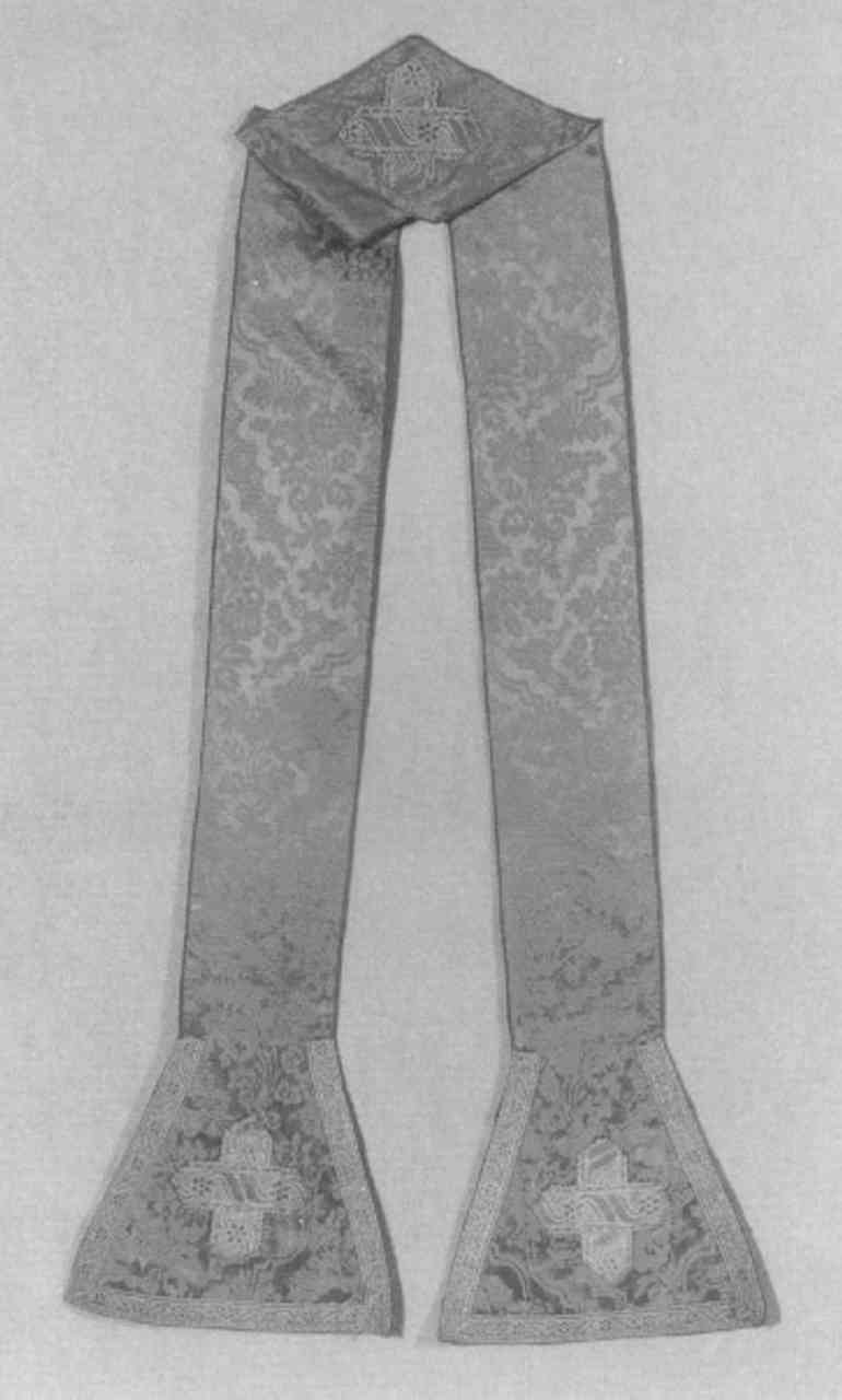 Fondo rosa. Decorazione: motivo a maglie ovali a doppia punta includenti mazzi di fiori; partiture geometriche e a tralci vegetali. Croce centrale e alle estremita'; bordi in galloni a telaio in filo d'argento e di seta
