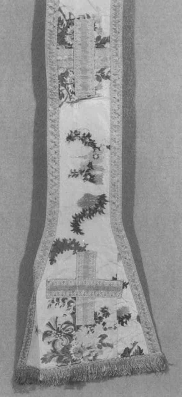 Fondo avorio. decorazione: motivo a meandri a impostazione verticale con foglie, bacche, piume intercalati da mazzolini di fiori in sete policrome. Croce centrale e alle estremita' in gal- loni a telaio in filo d'argento a motivi geometrici. Bordi definiti da frange in argento filato