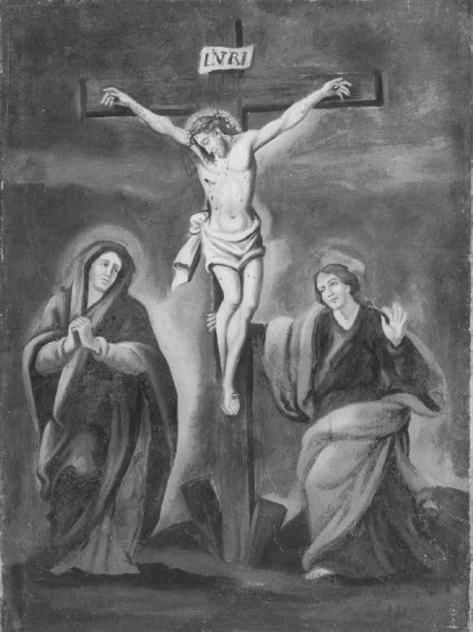 Personaggi: Cristo; Madonna; San Giovanni Evangelista. Oggetti: croce