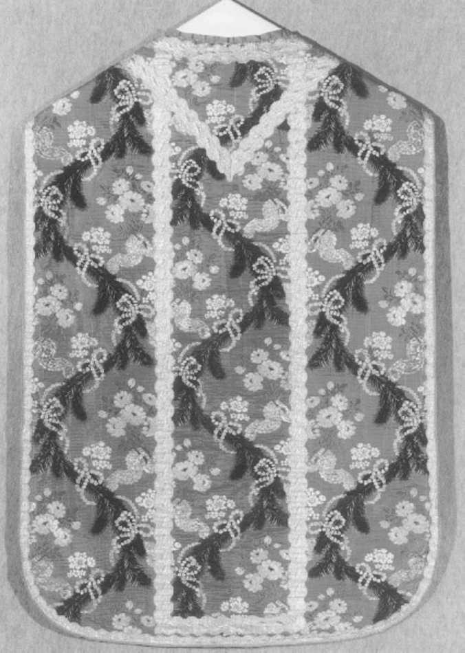 Tessuto: fondo rosa scuro con motivi ottenuti per trame spolinate in sete policrome seta ondata bianca e ciniglia rosso bordeaux e per trame broccate in argento riccio e lamellare e oro filato riccio e lamellare