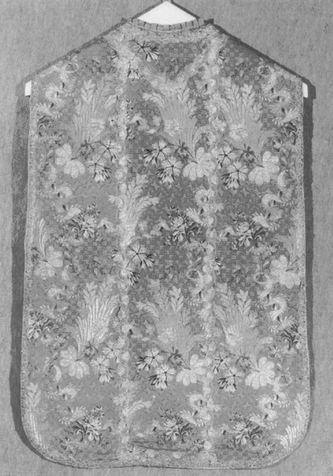 Tessuto: fondo verde oliva con effetti di controfondo per slegature d'ordito e motivi ottenuti per trame spolinate in sete policrome e trame broccate in oro filato riccio lamellare e argento filato