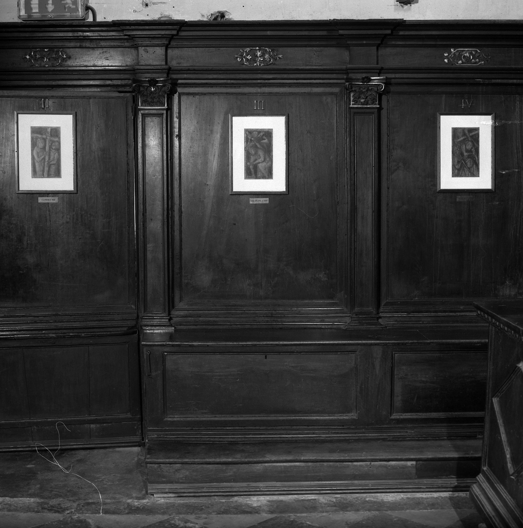 - NOTIZIE STORICO CRITICHE Decorazioni sul fregio in legno dorato. Alcuni sedili sono incernierati e fungono da cassepanche. Per la datazione, cfr. Lorenzetti. Cfr. nn. 00189281.282. Tra gli stalli, uno spazio libero per una porta, inserita nell'insieme