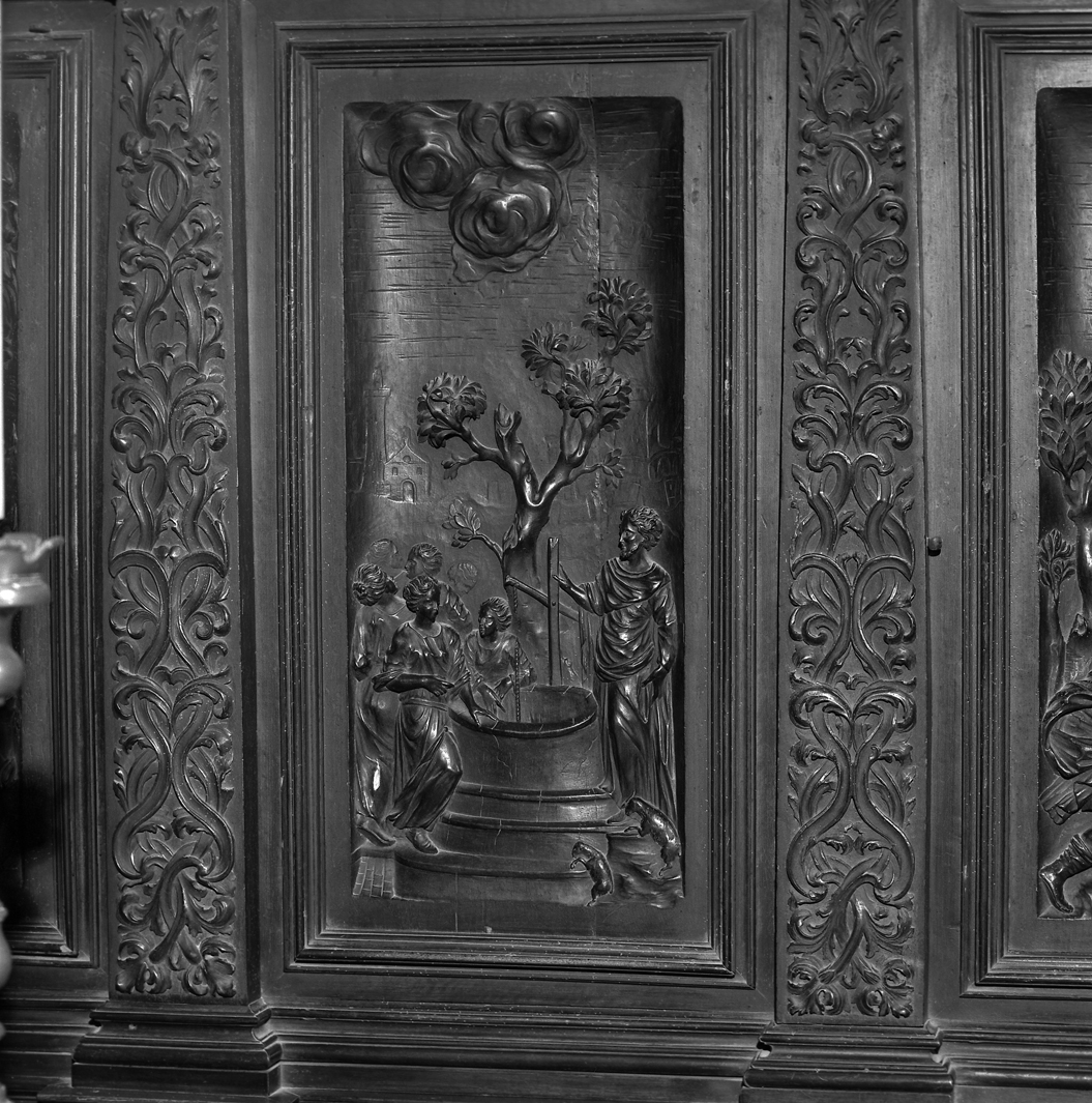 Schienale intagliato con l'episodio di Mosè che difende le figlie di Jetro