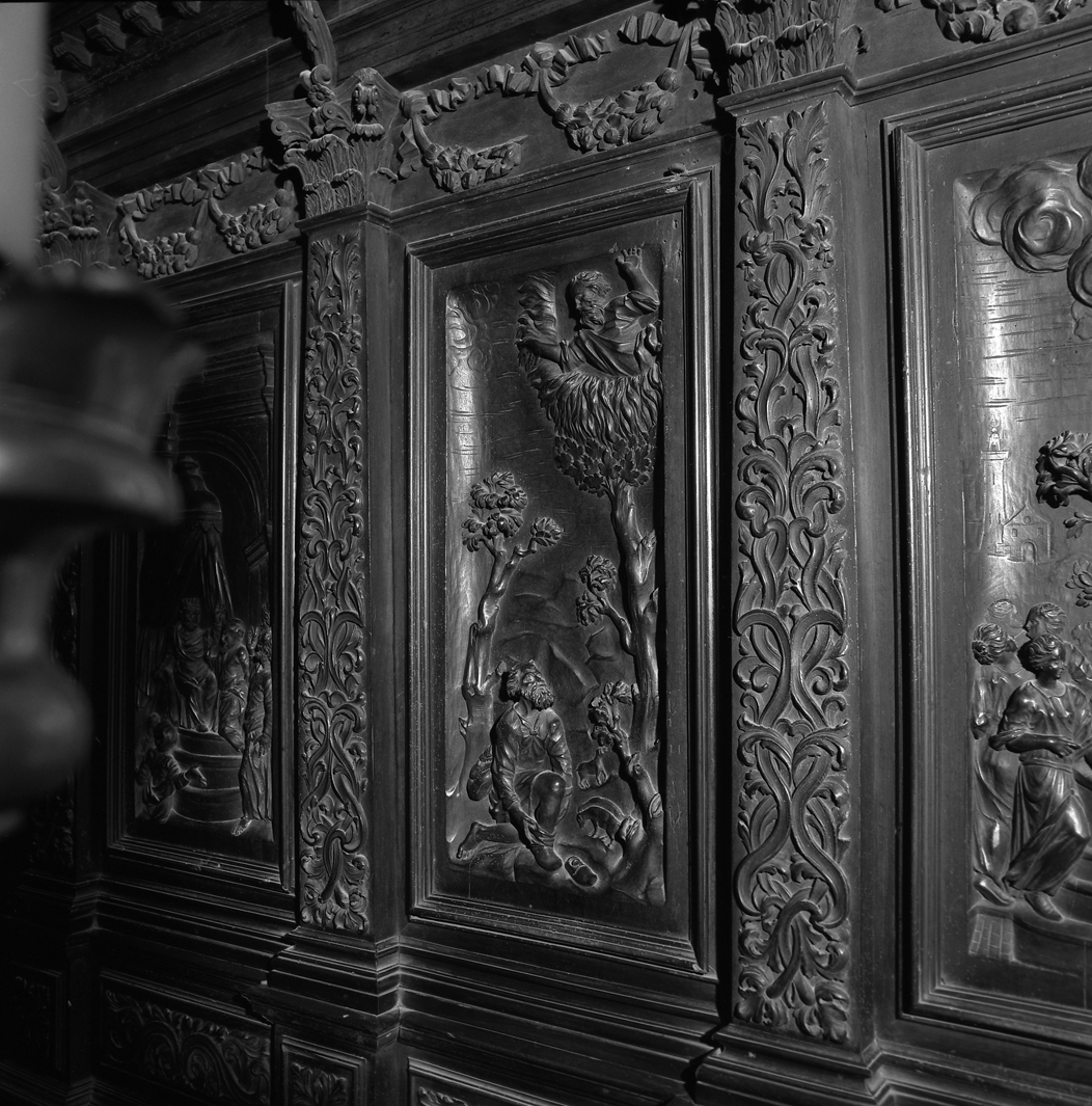 Schienale intagliato con l'episodio di Mosè che si toglie i calzari